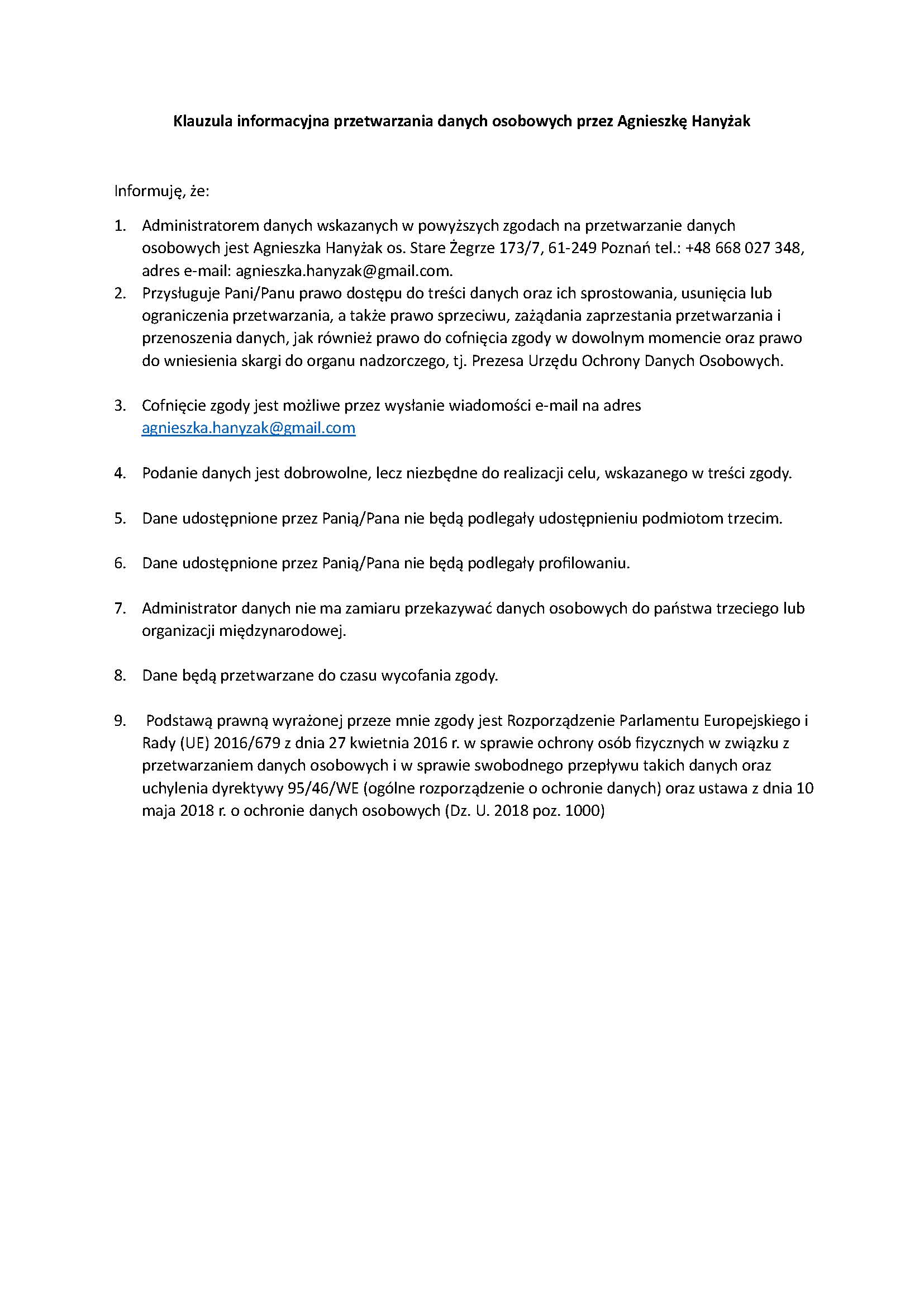 Wyrażam zgodę na przetwarzanie moich danych osobowych w postaci imienia, nazwiska oraz adresu e-mail przez Agnieszkę Hanyżak. Tym samym oświadczam, że chcę otrzymywać informacje o wydarzeniach i projektach organizowanych przez Agnieszkę Hanyżak lub z udziałem Agnieszki Hanyżak, publikacjach Agnieszki Hanyżak, wystąpieniach Agnieszki Hanyżak w mediach. Przetwarzanie danych przez administratora następuje zgodnie z załączoną klauzulą informacyjną.